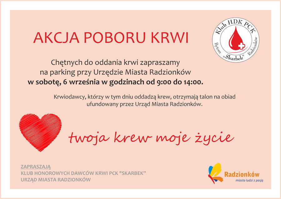 W sobotę, 6 września w godzinach 9:00-14:00, na parkingu Urzędu Miasta Radzionków przy ulicy Męczenników Oświęcimia 42 odbędzie się akcja poboru krwi.