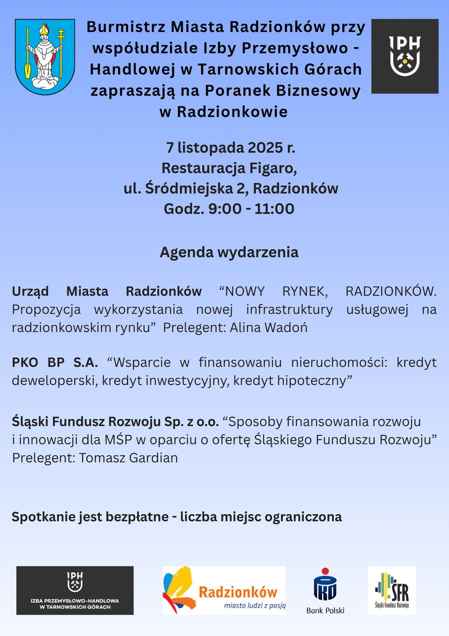 Szanowni Przedsiębiorcy, serdecznie zapraszamy na Poranek Biznesowy, który odbędzie się w piątek 7 listopada w Restauracji Figaro.