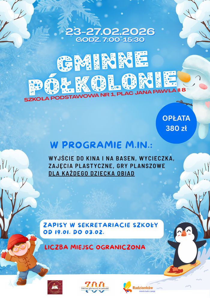 Szkoła Podstawowa Nr 1 wraz z Urzędem Miasta Radzionków zorganizują półkolonie dla dzieci klas 1-4 podczas zbliżających się ferii zimowych. Półkolonie zostaną zorganizowane w dniach 23-27 lutego, w godzinach 7:00-15:30. Warunkiem organizacji półkolonii jest zebranie minimum 30 chętnych uczestników.