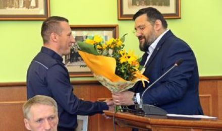 Podczas dzisiejszej sesji Rady Miasta, Przewodniczący Rady Miasta Radzionków Karol Majewski, złożył podziękowanie i gratulacje za bohaterską postawę zastępcy komendanta Komisariatu Policji w Radzionkowie, komisarzowi Jarosławowi Dembińskiemu.
