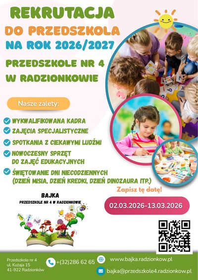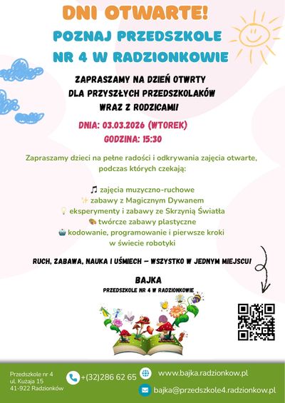 W programie m.in. zabawy z Magicznym Dywanem, zajęcia muzyczno-ruchowe oraz robotyka. Dzień otwarty odbędzie się we wtorek, 3 marca, o godzinie 15:30.