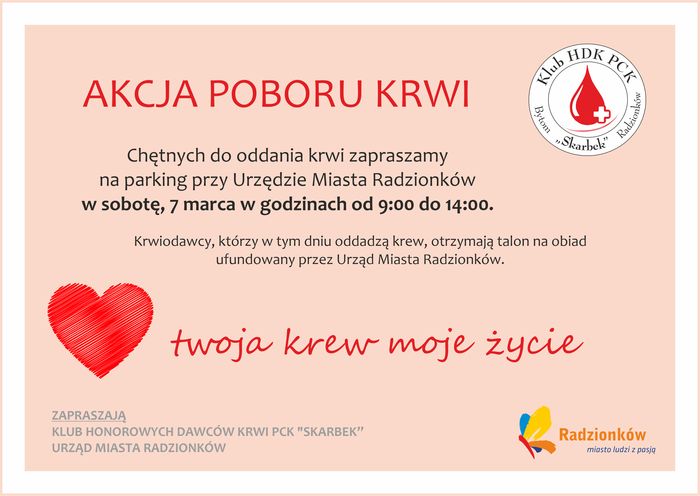 W sobotę, 7 marca w godzinach 9:00-14:00, na parkingu Urzędu Miasta Radzionków przy ulicy Męczenników Oświęcimia 42 odbędzie się akcja poboru krwi.