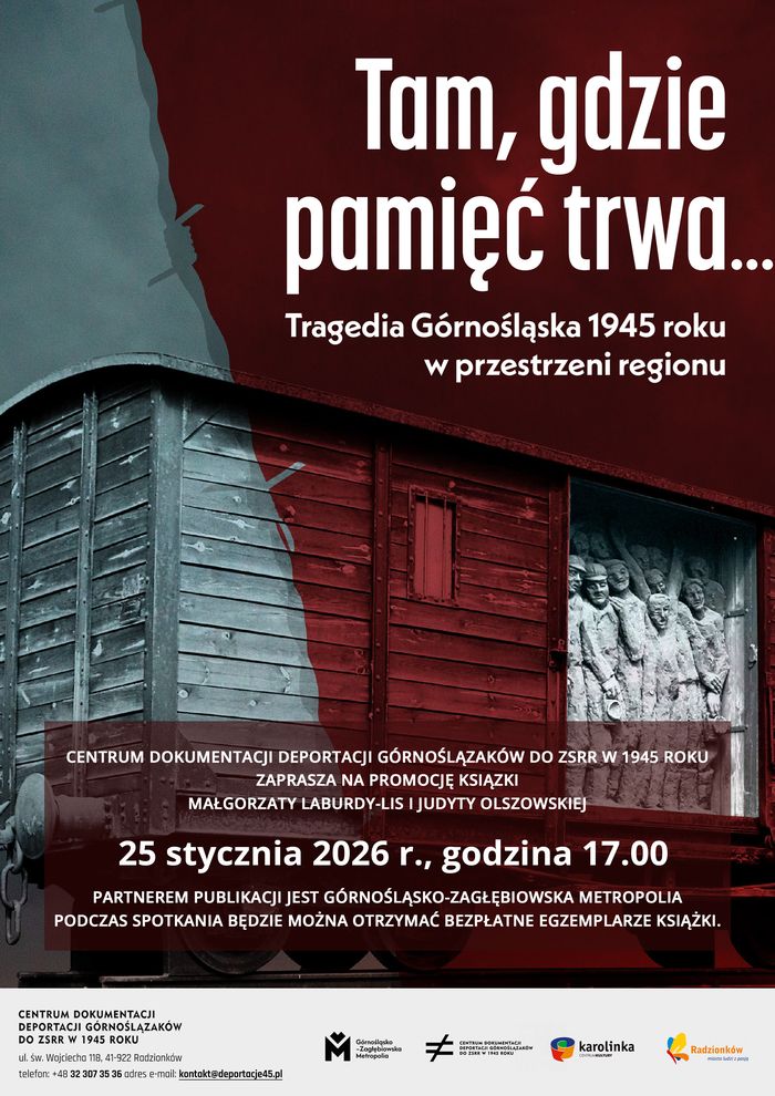 Centrum Dokumentacji Deportacji Górnoślązaków do ZSRR w 1945 roku zaprasza na promocję książki pt.: „Tam, gdzie pamięć trwa… Tragedia Górnośląska 1945 roku w przestrzeni regionu”.