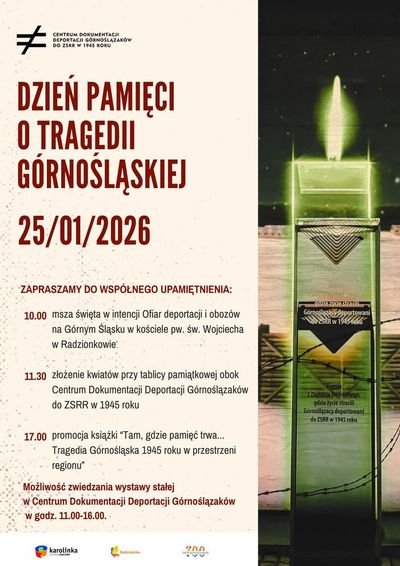 Obchody rozpocznie msza święta w kościele św. Wojciecha w Radzionkowie. Po niej zapraszamy do Centrum Dokumentacji Deportacji Górnoślązaków do ZSRR w 1945 roku, gdzie będzie można złożyć kwiaty przy tablicy pamiątkowej. W tym dniu odbędzie się także promocja książki pt.: „Tam, gdzie pamięć trwa… Tragedia Górnośląska 1945 roku w przestrzeni regionu”.