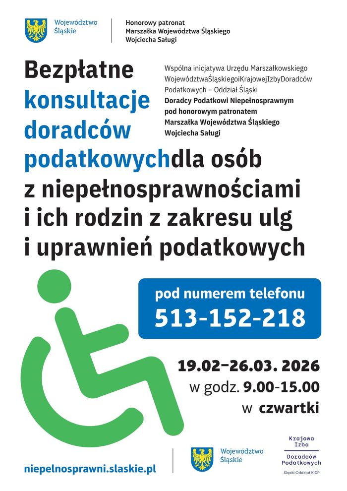 Śląski Oddział KIDP już po raz siedemnasty organizuje akcję pomocy w rozliczeniach podatkowych pod hasłem „Doradcy podatkowi niepełnosprawnym”. Potrwa ona od 19 lutego do 26 marca 2026 roku. Konsultacje podatkowe odbywać się będą raz w tygodniu, w czwartki w godzinach od 9.00 do 15.00 pod numerem telefonu 513-152-218.