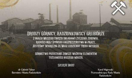 Drodzy Górnicy, radzionkowscy grubiorze, z okazji Waszego święta składamy życzenia zdrowia, radości oraz spokoju i bezpieczeństwa w pracy.